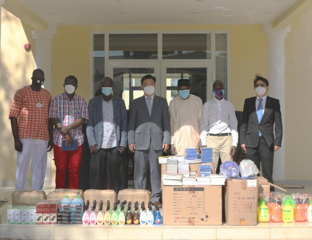 On 22 December 2020, H.E. Ambassador Ma Jianchun met with Principal Mamadi Ceesay of Nusrat Senior Secondary School. Mr. Ceesay was accompanied by former Principal Mr. Karamo S. Bojang and other management officials of the school. Ambassador Ma handed over to Principal Ceesay a new batch of books and videos for the China Cultural Corner at Nusrat school library, along with some stationery, sports equipment, and health equipment to support the school in preventing COVID-19 and in better carrying out teaching activities.