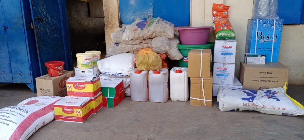 The donated food items included bags of rice, gallons of oil, bags of onions, detergent soups, buckets and so on.