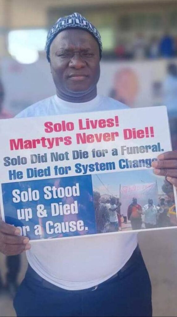 Speaking to the press shortly after the tribute ceremony with a placard in a procession Madi Jobarteh said: “Solo did not die to be given a burial, he got up because he wants to salvage the Gambia, defend human rights, democracy and rule of law and that he was the catalyst that brought us where we are today therefore Solo died for a cause.”