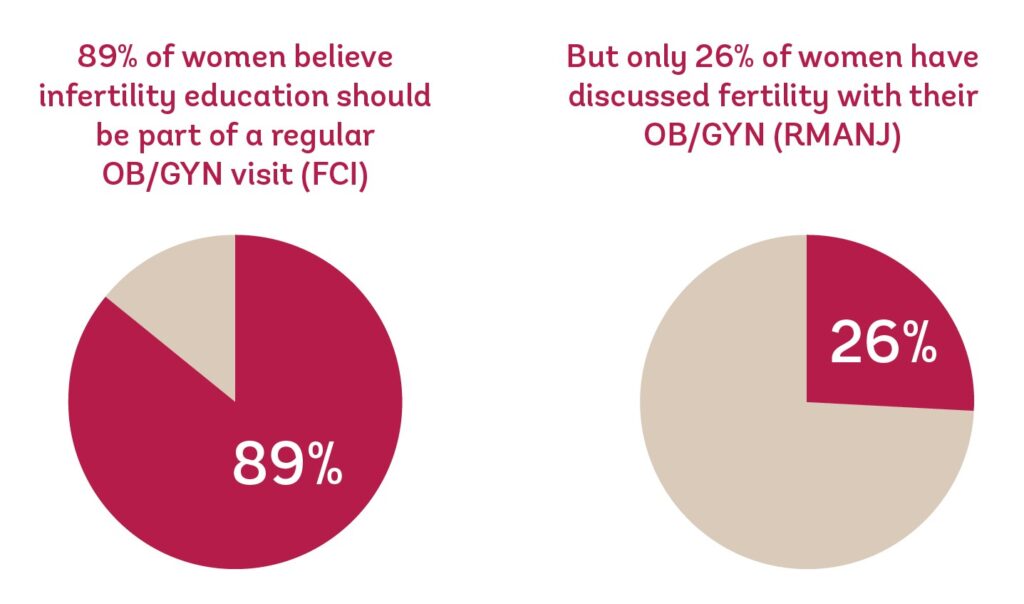 How can this be?! It seems like everywhere we look, people are talking about fertility—but it turns out they’re not having the conversation where and when it matters. The RMANJ survey revealed that only 26% of women surveyed have had conversations with their OB/GYN about fertility and nearly half (42%) of women surveyed who had experienced infertility reported that their OB/GYN never started a conversation with them about fertility.