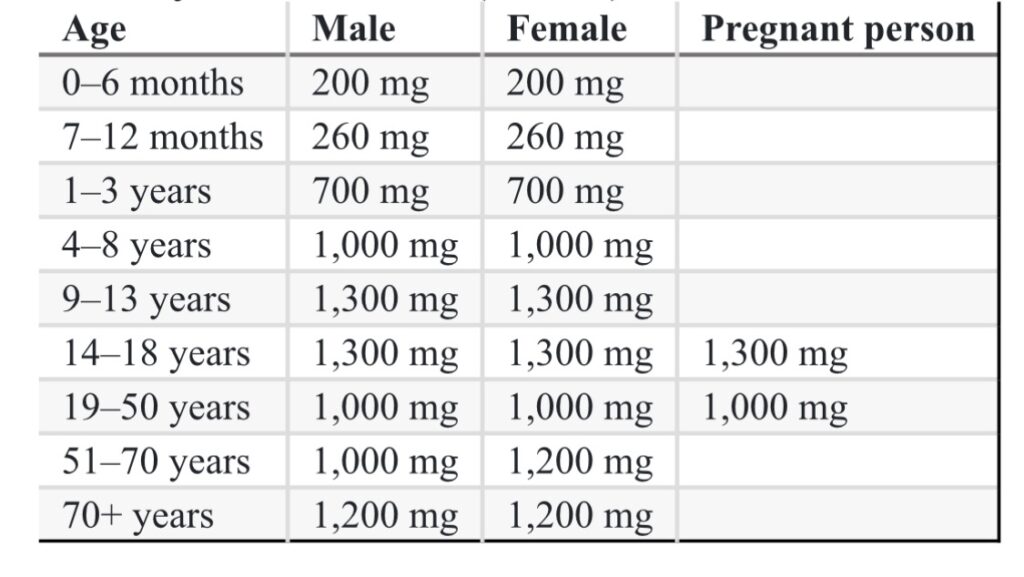 The amount of calcium needed depends on the age and stage of life. National Institutes of Health Office of Dietary Supplements(2024) provided the following recommended dietary allowance (RDA) of calcium in milligrams (mg):