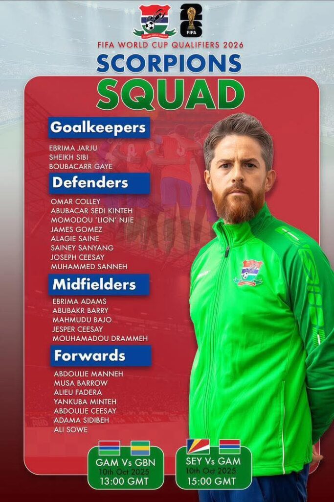 Gambia head coach Johnathan McKinstry has announced a 23-man squad for the national team’s final two World Cup qualifiers against Gabon and Seychelles later this month.